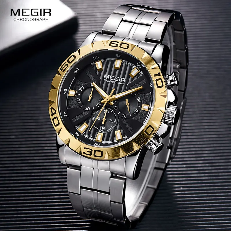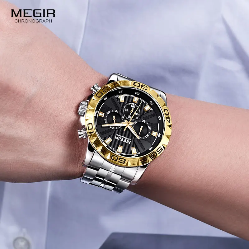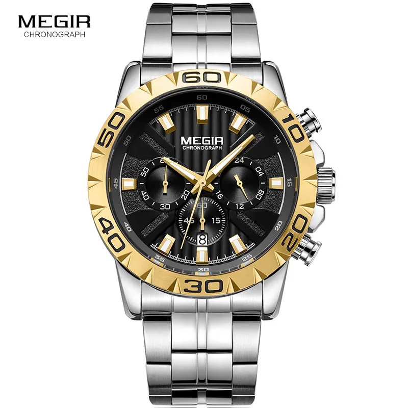 - Megir Men's Gold Stainless Steel Quartz Watches Business Chronograph Analgue Wristwatch for Man Waterproof Luminous 2068GGD-2N3 : Click here